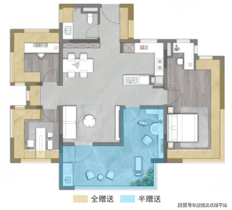 赠送:厨房+生活阳台+卧室部分空间全赠送,景观阳台半赠送
