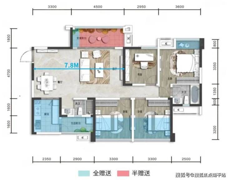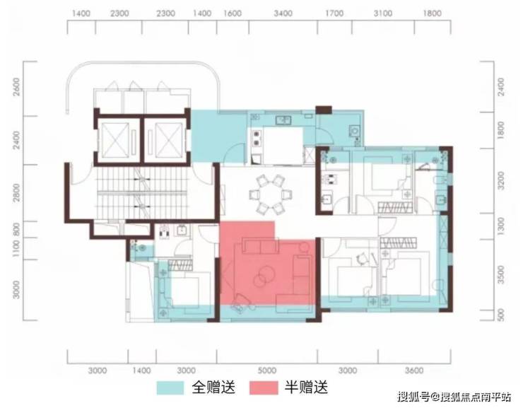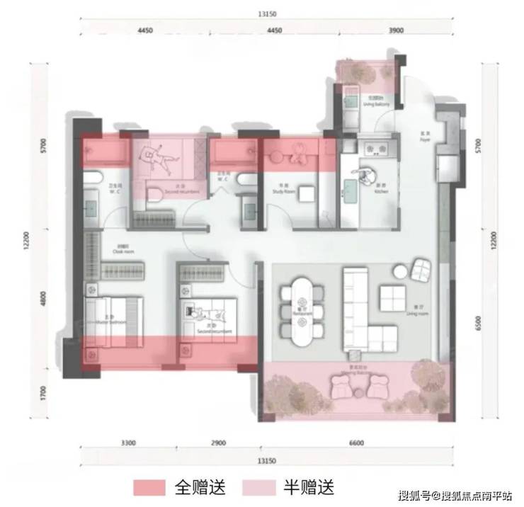 赠送:独立电梯厅约 7㎡+ 全屋假飘窗 + 客厅半赠送+设备平台(生活阳台)