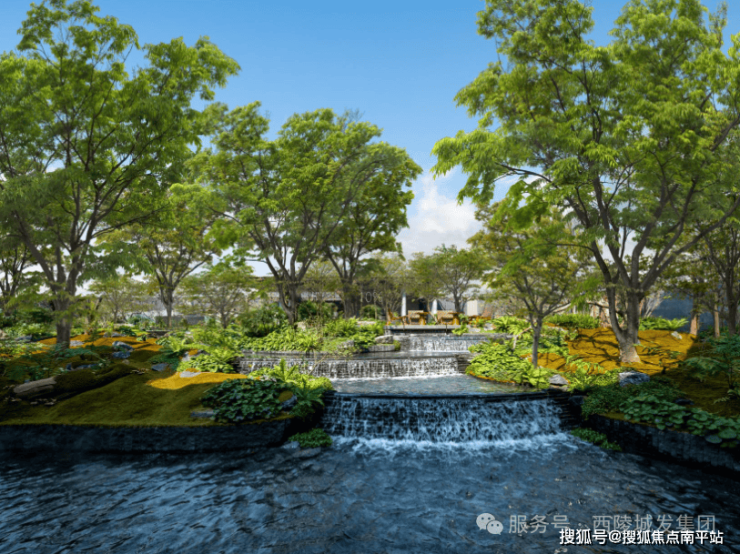 森系园林,山水奢藏。用在地的方式,将水、林、石、亭等自然元素与小区景观充分融合,潺潺流水映衬的景墙、隐匿于绿意盎然的休憩卡座,享受休憩与会客的乐趣,将仅供少数人专享的度假体验,变为业主的日常享受。