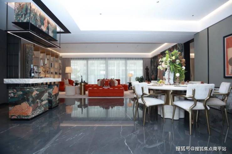 建面约167㎡户型堪称「空间王者」,更偏老钱风的 「海底珊瑚林」主题,LDBK一体化设计聚合成巨大的社交客厅,满足塔尖客户的品质感需求。