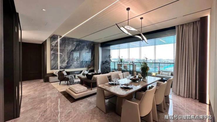 大量采用以海底「青绿水色」主色调的岩板,展现低调奢华感,甚至连墙面的底部以及墙角出都用岩板包覆,整体用材用料已经超越很多一线城市项目。