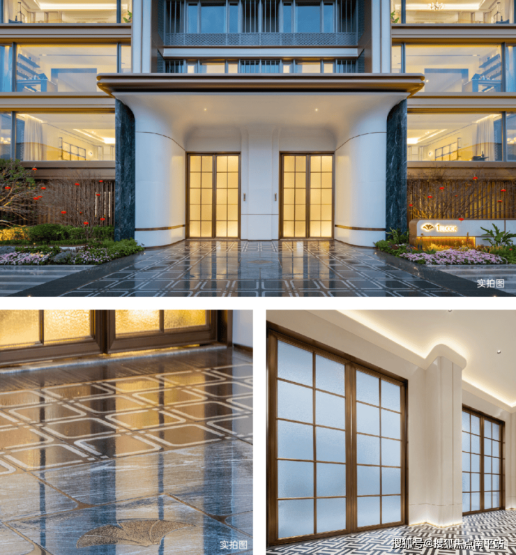 约30米宽华尔道夫酒店式门仪,沿袭故宫与凡尔赛宫中轴对称形制,高达6 米的巴西高配奢石“雪山蓝”矗立其中,卢浮宫同款选材“贝金米黄”景墙层层递进,挪威“蓝珍珠”水景肌理深蕴奢华,尽显高定归家的荣耀仪式感。