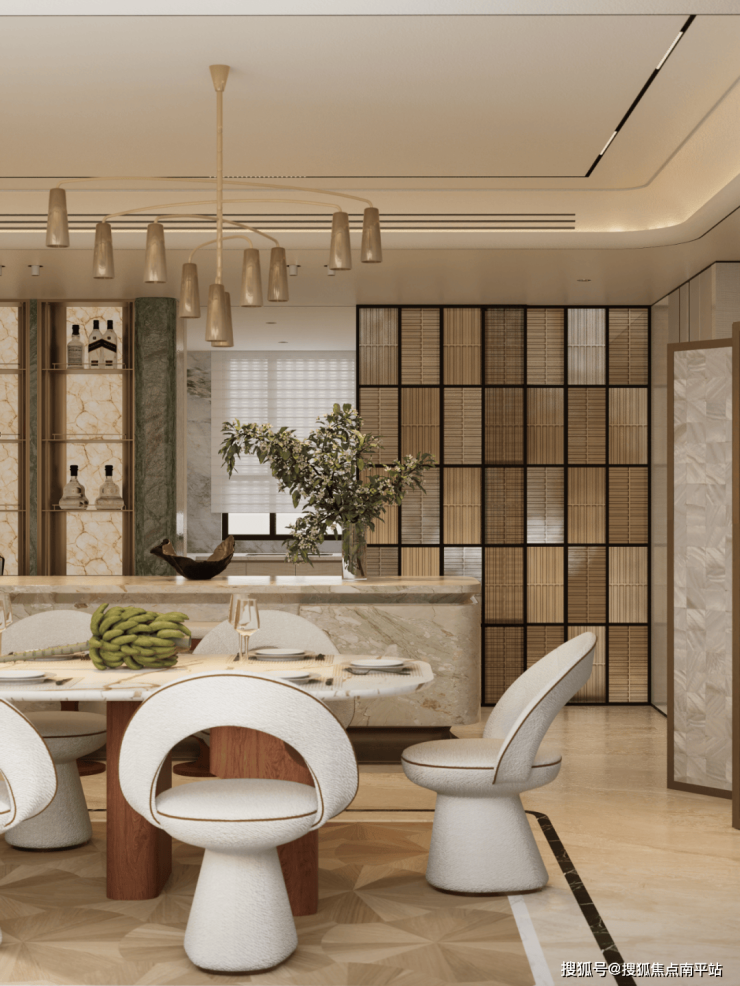 几何拼花大理石地面,像一幅流动的艺术画;同色系的弧形餐椅,与椭圆形餐桌形成呼应,弱化了传统餐厅的严肃感。贝壳纹屏风作为空间的隔断,既通透又有层次;