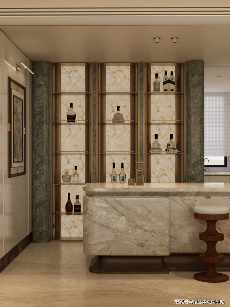 大理石台面自带流动纹理,与两侧翡翠绿大理石立柱形成呼应,黄铜酒架在温润木色与冷调石材之间,点亮了空间的紧致感;