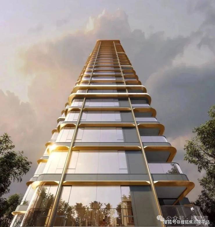 项目建筑外立面采用全玻璃+铝板幕墙体系,,大面积采用玻璃幕墙、铝板线条、香槟金穿孔铝板以及仿石涂料,搭配优雅的弧形设计手法,增加了外立面的高级感。
