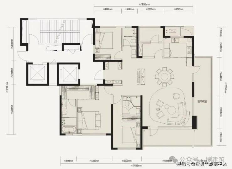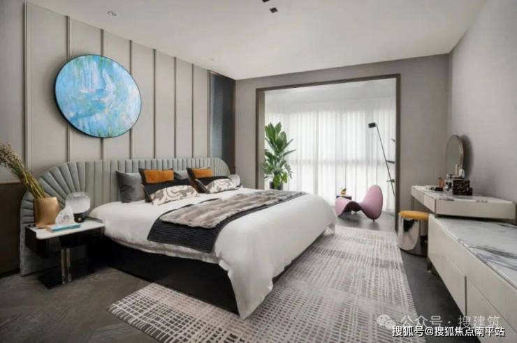边厅设计,三面采光,带来无边界视野体验。主次卧分列两端,动线完全分离,互不打搅。主卧约5.2米的超大面宽,主卧套房约43.4㎡,而且还是270°的观景面,给足主人大尺度私密舒适的空间。