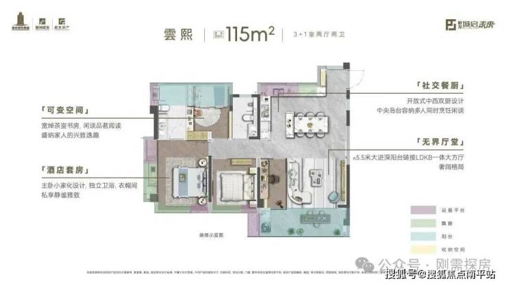 115平:3+1房,在大面宽布局下,没有刻意去做四房,保留了约 5.5米宽的大横厅,规避了市场同类型产品的南北不通透,让客餐厅做到了很好的 采光对流。