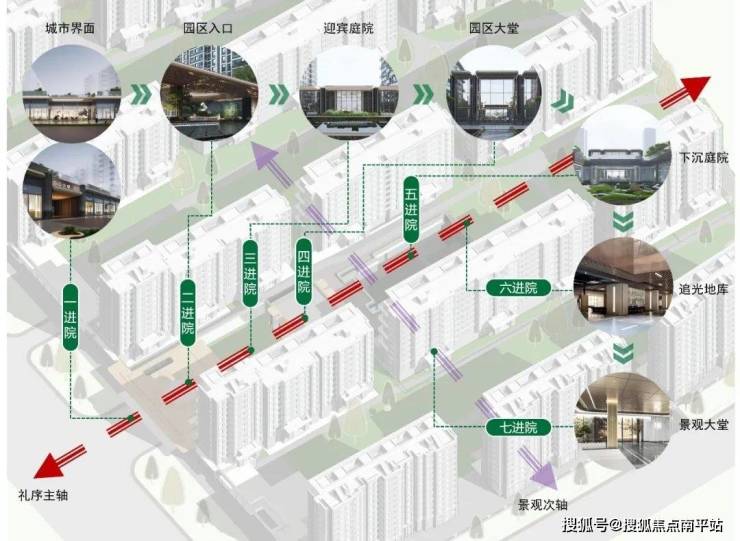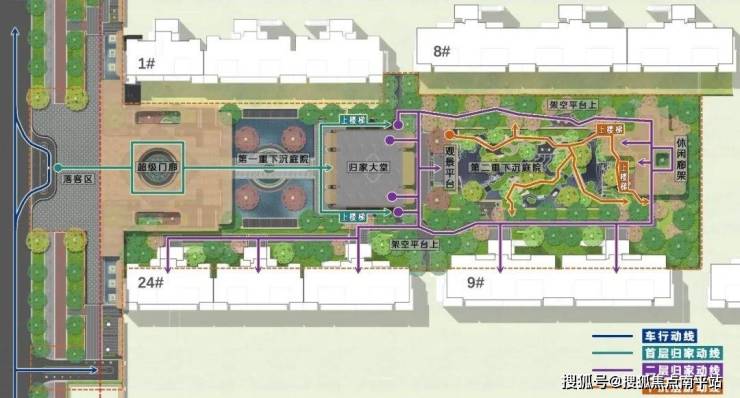 规划设计上利用贯穿围合的下沉庭院,多级立体的生态花园,使单一的空间被赋予丰富的层次,呈现生态花园般的视觉效果,结合社区入口,打造1.6万㎡ 全维实景示范区。