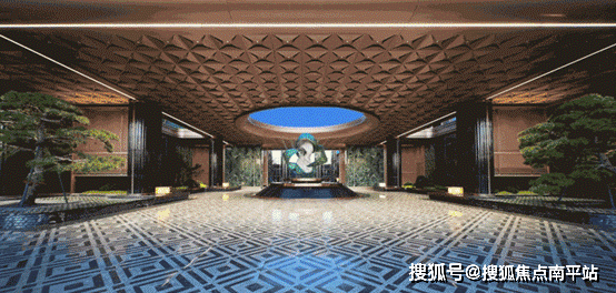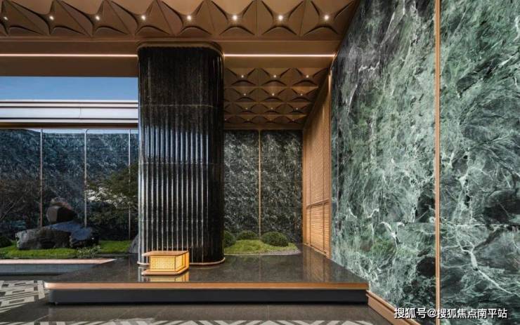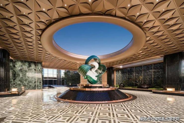 作为归家的礼仪门面,翡月之门凝萃着绿城对时代美学的极致思考, 66米奢石落客区、奢华酒店式归家大堂、约1600㎡架空泛会所、立体式花园建筑、顶跃高厅、奢适空间;酒店式礼序入口,松礼迎客,中心处的水景叠级呈现,结合雕塑营造入口仪式感及尊贵的归家体验。对于材质的选择与组合、形体比例的推敲、拼接面的分缝与拼合等工作的精细考量,提取时代的花纹,巧妙设计在空间里,让空间不经意地流露历史的品质。