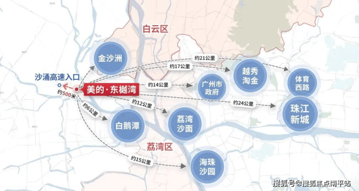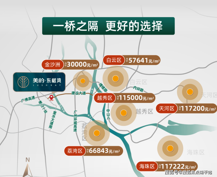 东樾湾至沙涌高速入口约500m,连接佛山千灯湖;经佛山一环约半小时内与广州各核心片区无缝对接。有轨电车(在建)更将串联佛山8号线、广州12号线,构筑约30分钟广佛融城生活圈。