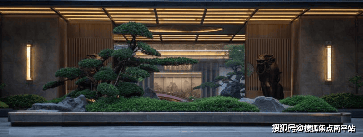 入口景观盆景取文房四宝之砚台为灵感,用岭南山水盆景和砚台结合的一种演变仪式,营造诗书礼境迎宾之景。以砚洗心,以松点睛,寓意名扬天下,欢迎四面八方之客。