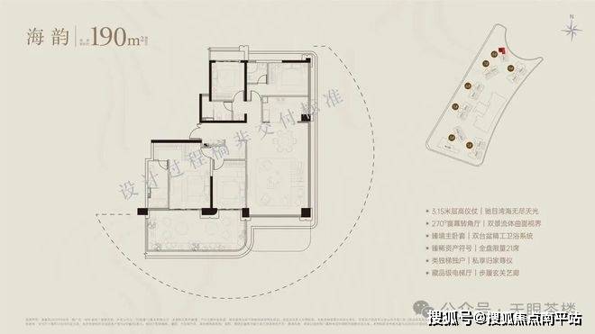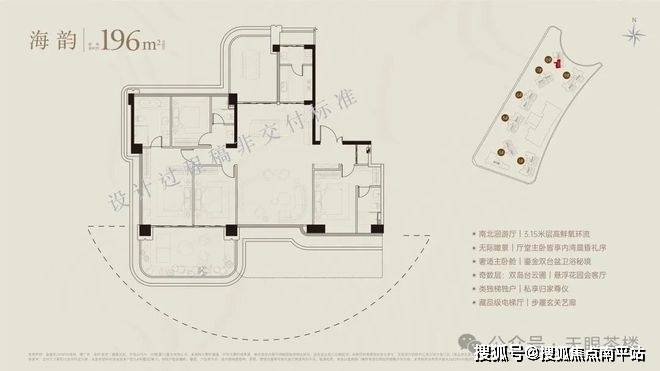 191-196㎡户型:四房三卫,3.15米层高,270°寰幕转角厅,双景流体曲面视界,偶数层带星空沙龙露台,奇数层有悬浮花园会客厅。