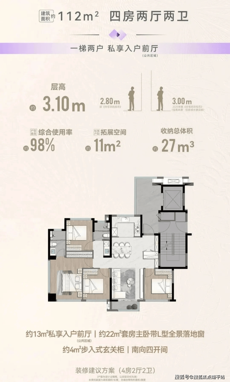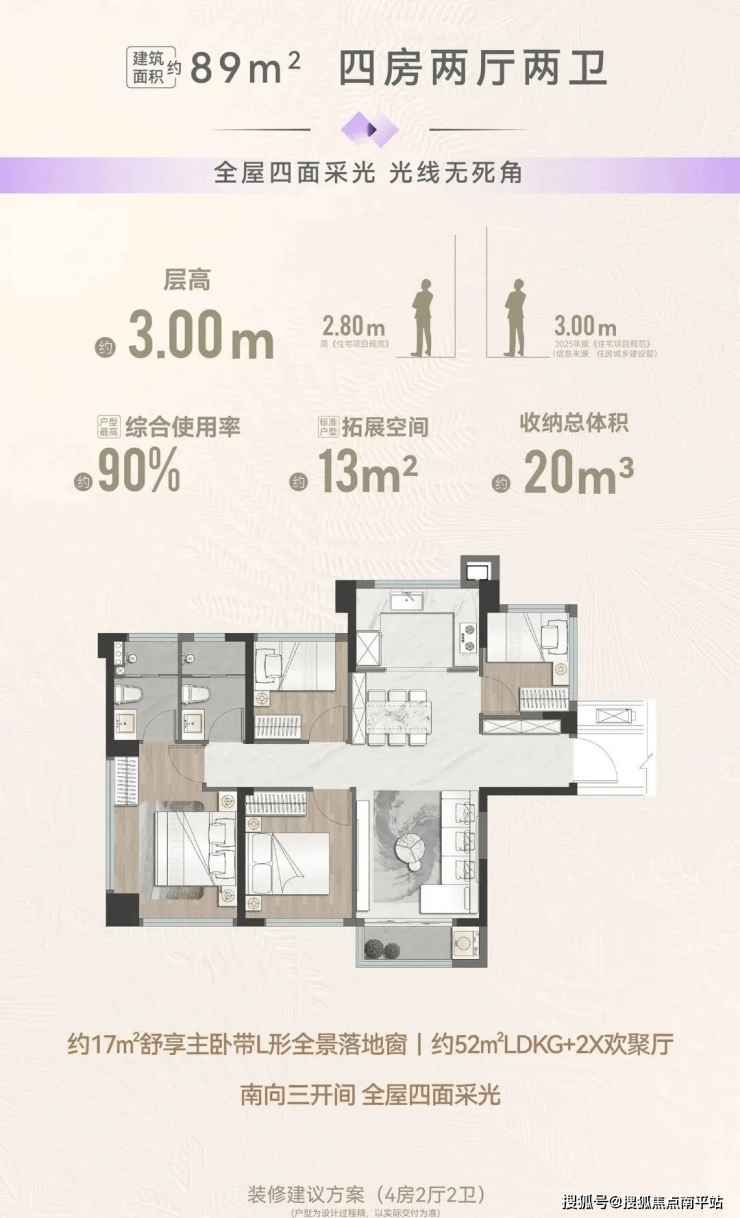 项目规划4栋高层2梯5户,64平2房、75平3房、79平3房、89平四房(得房率85%—90%)层高3米;5栋洋房1梯2户,95平四房、112平四房(得房率97%—98%)层高3.1米。户户均有外阳台。