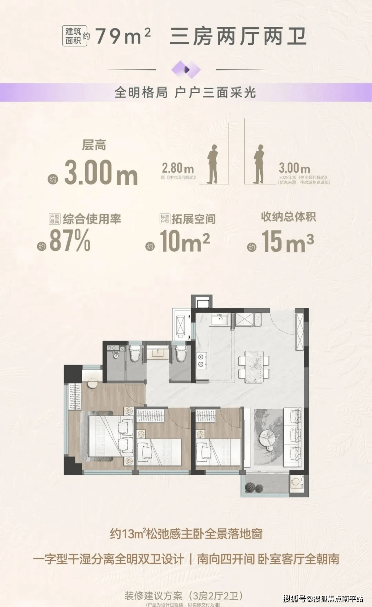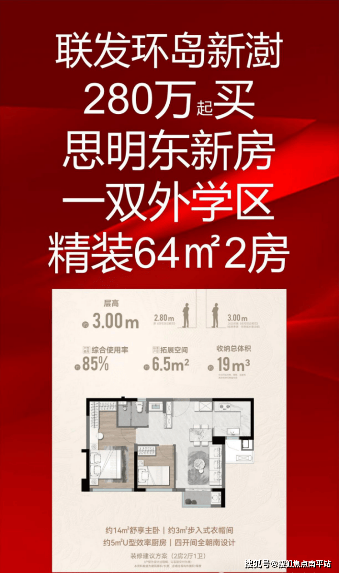 280万起抢思明一双外64㎡2房!85%的高得房率,相于市面上75㎡的户型使用空间,击穿岛内思明区新房房价底线。