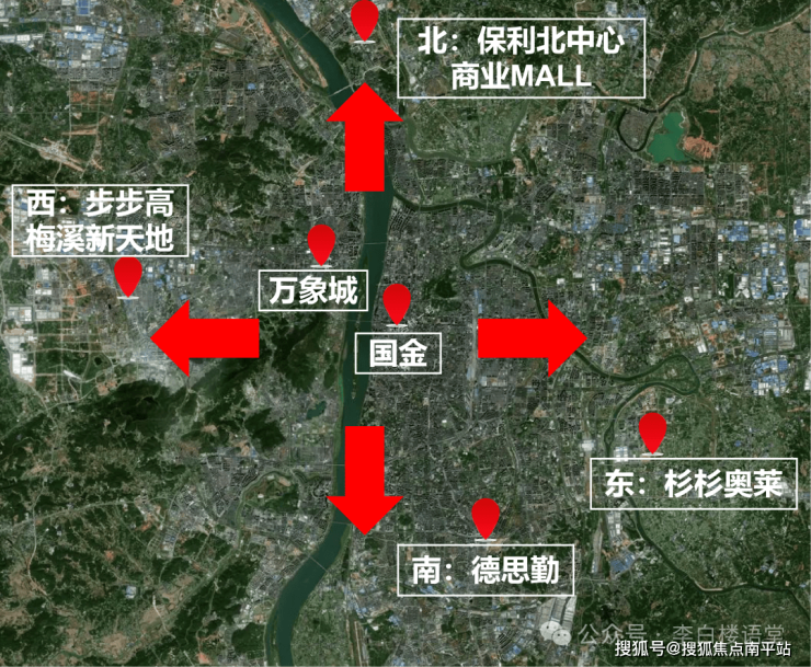 至此,在中心城区五一商圈+河西主中心万象城外,长沙东西南北会形成四大商业聚集区,分别引领者,如图所示: