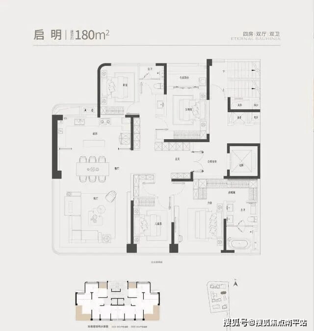 ③启明180平户型,四房两厅两卫:位于 2 号楼,同样规划为四房两卫格局。因户型实现三面采光,所以将 LDKB 一体化空间设置在东西向,并搭配 270 度封闭式阳台,主打观景功能。2 号楼处于小区内部,不靠近主干道,其中西边户能欣赏小区园林景观,东边户的景观视野则相对逊色。该户型的主卧空间规划得格外宽敞,这一点我个人比较认可;南向还设计有一间书房,北向则分布着两间次卧、一个公卫,以及一个开放式生活阳台。