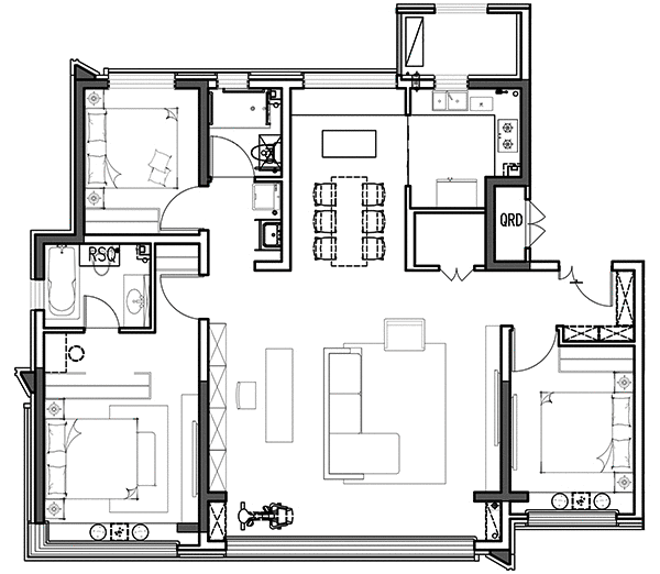 这个空间就好像四合院里的中心庭院,所有的房门均朝这里开,彻底消灭了走道,也就避免了面积浪费,给客户至少能节省几万块钱。