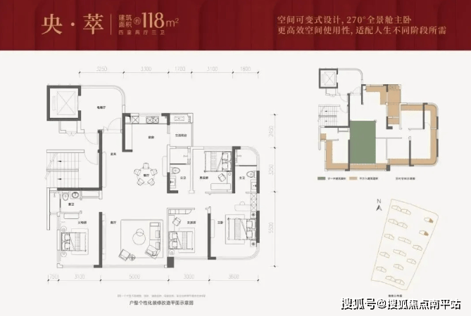 建面约118㎡户型,套内实得面积约133㎡,得房率超112%(不含电梯厅),可媲美旧规150㎡;