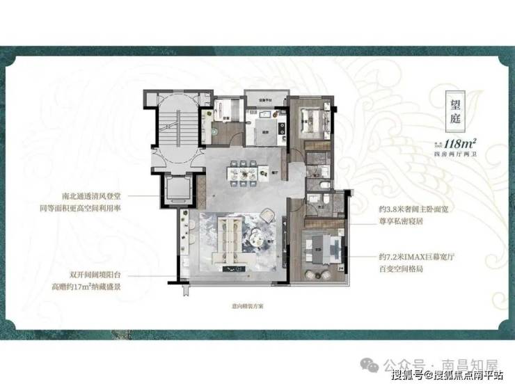 如 118 平的洋房改造性强,可做三房享受 7.2 米大横厅,也可改造成四房,四叶草设计几乎无过道,空间利用率高;136 平的洋房南北通透、4 开间朝南,南向约 15 米面宽、独立电梯厅、主卧 270° 转角落地窗。
