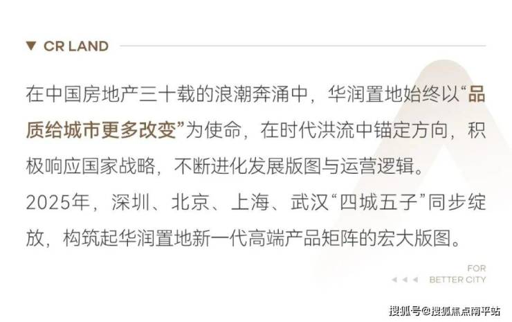 宏大的时代背景下,华润置地以「长江战略」精准落子,从武汉瑞府、长江中心到长江天际,一系列作品星布世界武汉的长江中轴,以恒产版图辉映城市雄心,著写出“一江两岸恒产,半壁华润置地”的品牌声望。