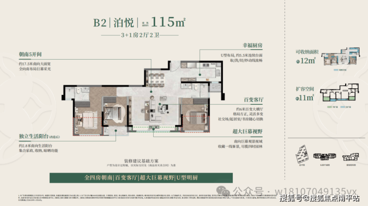 270°观景主卧配备酒店式套房设计, L形观景窗正瞰中庭水景; 全景U型厨房餐客厅一体化,搭配 科学四分公卫收纳/家政一体化设计, 独立生活阳台改造后约3.1米南向,生活高效又温馨,这才是理想家的模样!
