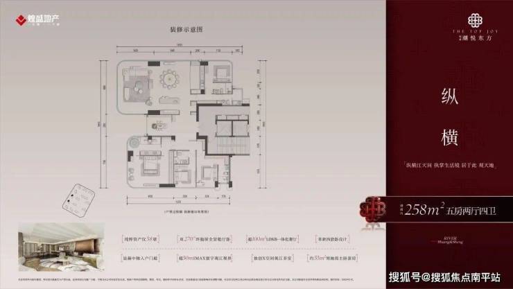 200㎡户型双 270° 环抱屏全景舱厅卧,超 17 米观江面,约 85㎡LDBKX 社交中心;258㎡户型墅级超 100㎡LDBKX 横厅,可布置中厨、西厨等,空间阔绰。