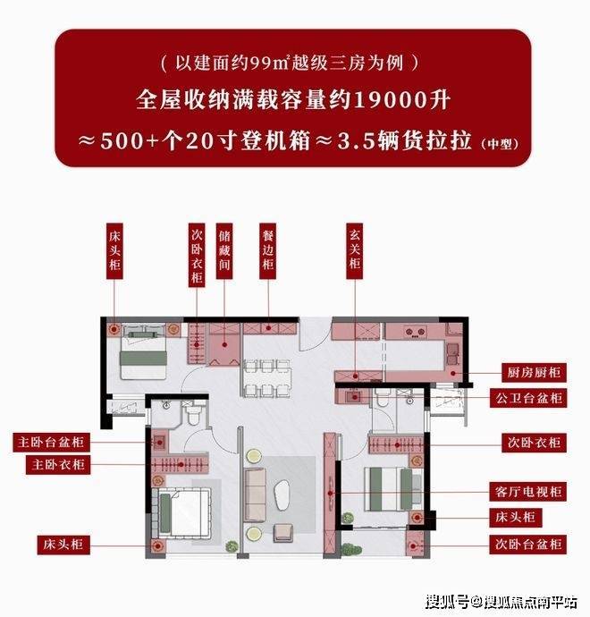 以建面约99㎡户型为例,全屋收纳满载容量约19000升,可装下约500+个20寸登机箱!配备独立储藏间,同时在玄关处、厨房、卫浴间等高频率生活场域,均预留储物空间;在餐厅、客厅等社交型场域,充分利用墙体宽度嵌入超长柜体;卧室则融入步入式衣帽间或预留衣柜空间等;阳台上亦配置多元储物柜,让家里所有的物品都能各得其所。
