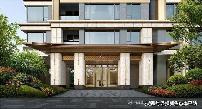 项目以高标准精筑楼栋入户,双飞檐门头勾勒东方意蕴,与整体建筑优雅共鸣,辅以石材幕墙、香槟金铝板、超白钢化夹胶玻璃,共筑高级质感门庭,极大提升入口昭示性及归家尊崇感。