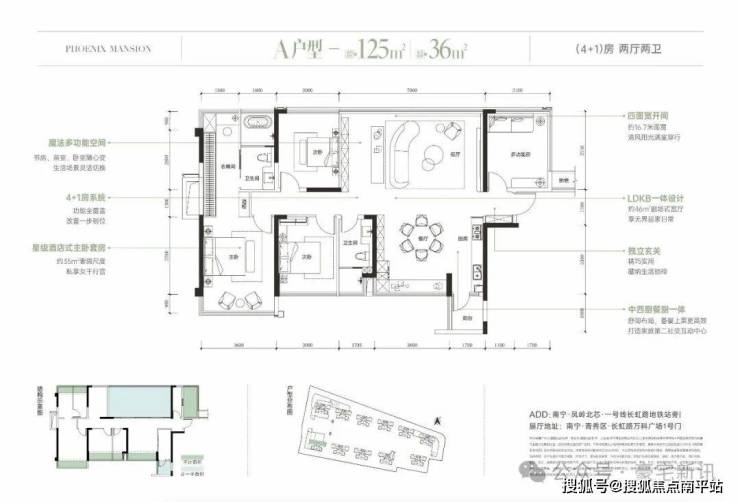 ▋金牌户型:建筑面积约125㎡ 4+1房两厅两卫 可拓展面积约36平米 得房率约115%