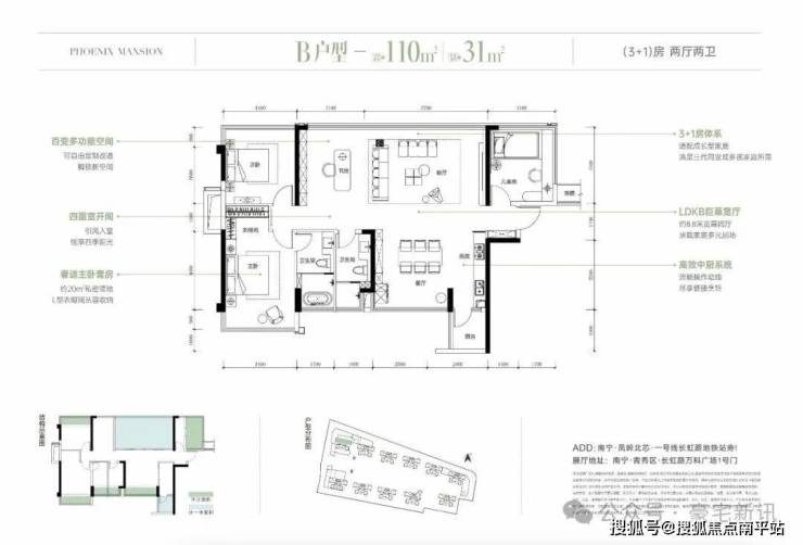 ▋人生进阶:建筑面积约110㎡ 3+1房两厅两卫 可拓展面积31平米 得房率约115%