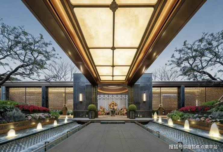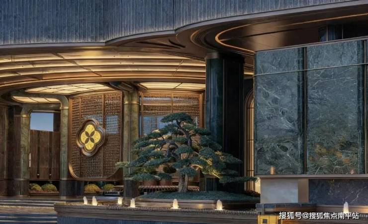 入口约76.7米宽、8.8米高的恢弘尺度,中交·文澜天玥打造岛外最大门庭之一。门庭以海派南洋风为基调,复刻鼓浪屿八卦楼的中轴对称形制,双圆悬挑云母石鎏金穹顶融合容谷别墅与客家土楼意象,寓意圆满和谐。奢石景墙、迎客松、闽南花砖与非遗珠绣格栅相映,将东方美学与南洋优雅凝练于细节。