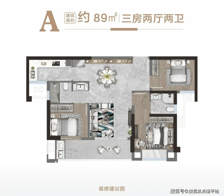 小面积如何承载实用与舒适的平衡?瑞景湾巧妙地将使用面积塞进改善功能,89㎡做三房,堪称空间魔术,直接比肩东海建面约110㎡左右的二手房;餐客厨一体化通厅设计无缝衔接观景阳台,三开间朝南的格局让阳光成为日常标配;厨房、卫浴全明通透的科学规划,更将小户型的舒适性与实用性推向极致,精准适配刚需家庭的核心居住诉求。