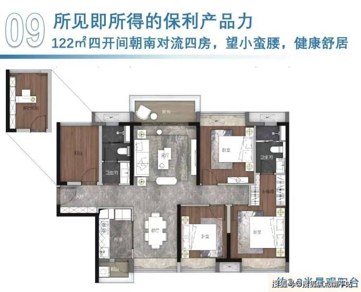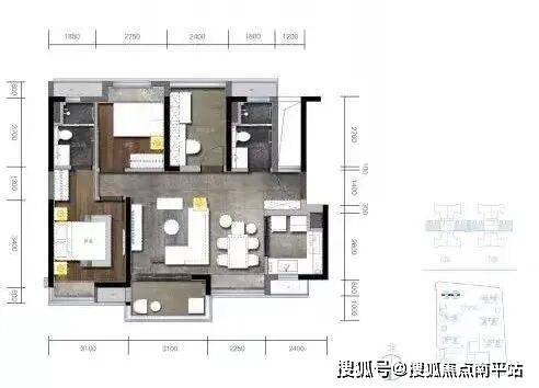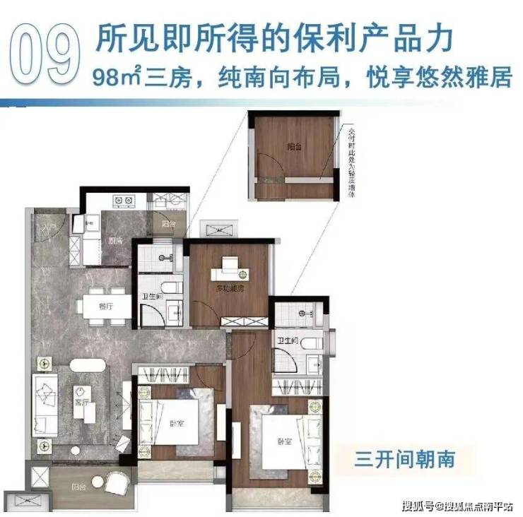 该户型跟115方户型布局基本一致,亮点在于带一个6.7米长南向景观阳台,贯通次卧。
