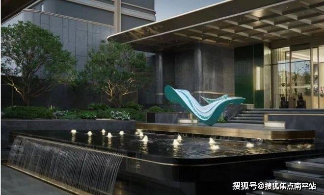 水景中央矗立着一尊飘逸灵动的江水雕塑,碧玉般的颜色十分吸睛。