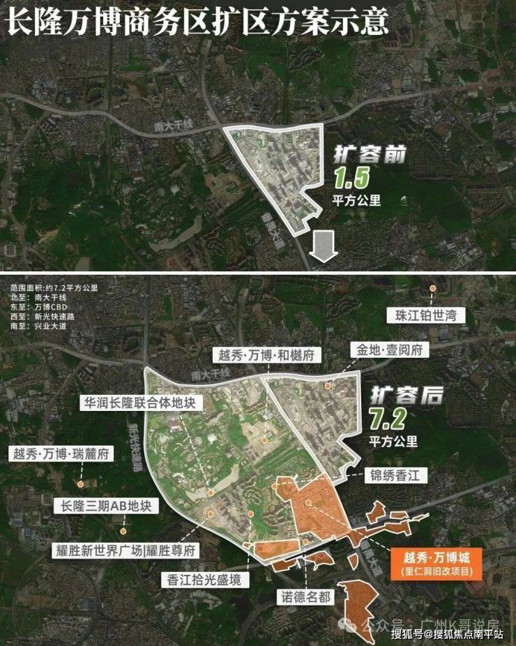 去年4月,万博官宣扩容,占地面积由1.5平方公里延展至7.2平方公里,覆盖长隆、里仁洞片区,规模甚至超越6万平方公里的珠江新城,剑指世界级地标商圈。