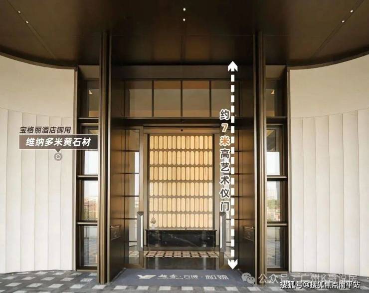 一进大门,整个入户大堂以宝格丽酒店设计风格为灵感,每一个细节都透出映射质感。约7米高的艺术移门辅以奢石弧形墙面,以强烈的仪式感,勾勒通往越秀·万博和臻的“玄关”。