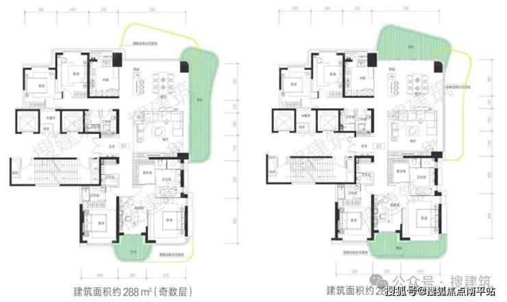 同样是建面约288㎡的奇数层和偶数层户型,其最大的区别在于阳台的位置。南北双阳台双A立面,从南北看效果都一样,最宽约4米的悬挑阳台,采用柔美的弧形曲线,错层挑空,层高达到6.3米,既让外立面显得更灵动跳跃,也提升了居住舒适性。