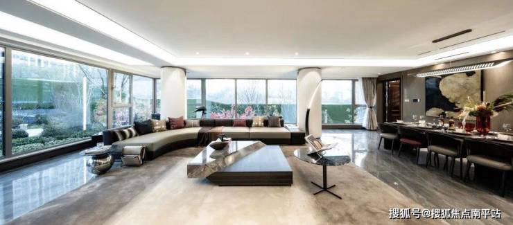 270°环幕客厅,Super Flat曲面转角玻璃幕墙、金镶玉高级工艺,带来“超平面”美学体验,阔达8、9米的落地窗,让室内空间与室外景色的界限消融,呈现非凡的享受。