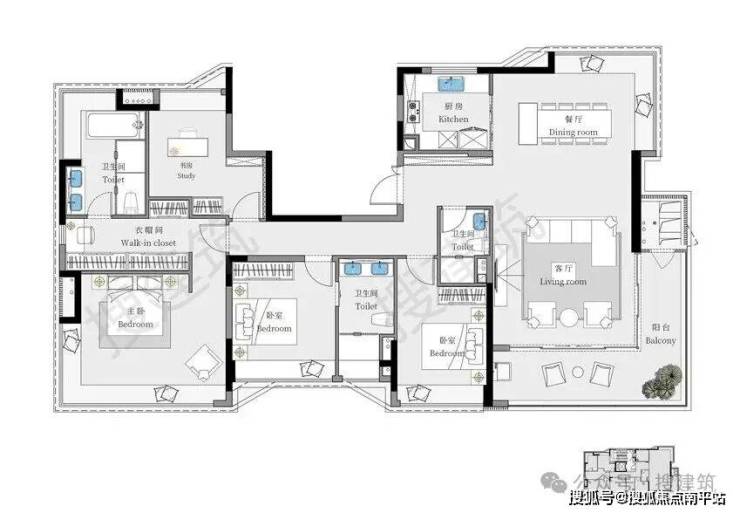 建筑设计引入“无界”创新理念及“LDKS-B”空间模式,模糊室内外的界限,将客厅(L)、餐厅(D)、厨房(K)、书房(S)、阳台(B)进行联动及打通,营造互动、开放、可变的居住空间,创新城市生活方式。