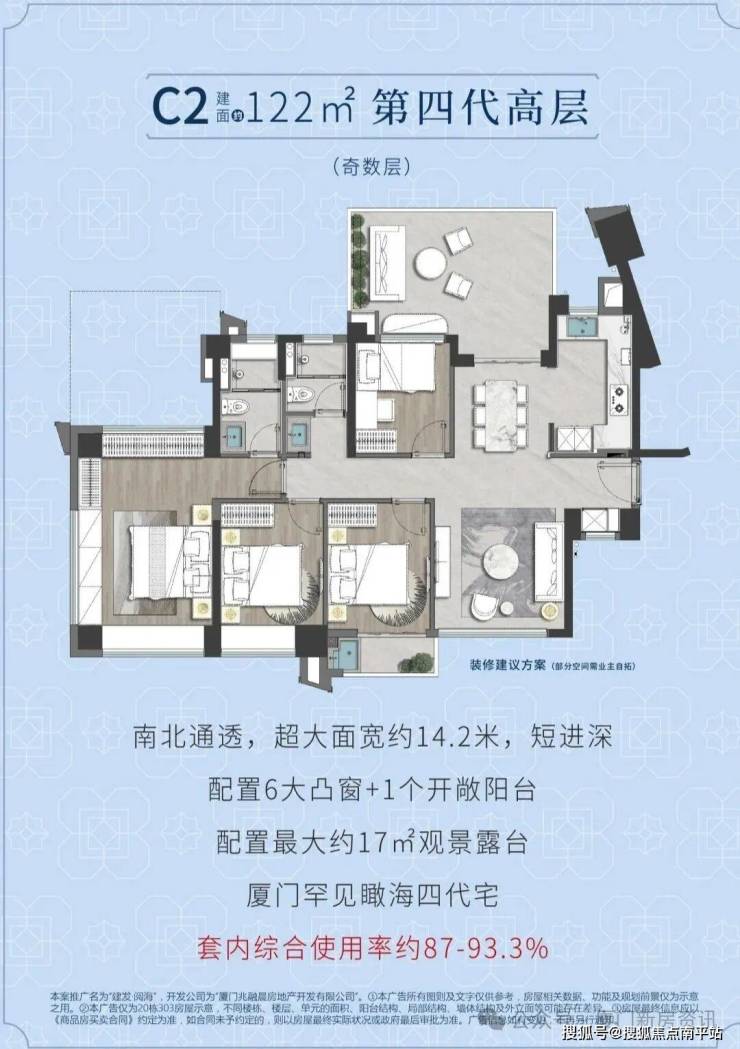 新Y字型楼栋设计,营造户户三面采光的通透格局,89㎡的户型设计把空间做到了极致,两梯三户+四房。全屋六大飘窗+1个开放式阳台约87.4%综合使用率,以及120㎡以上第四代产品享空中花园,洋房户户带入户花园,2-4楼额外配置晒台。