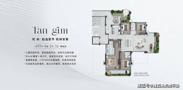 保利·天珺主力户型面积约187平,天字系+第四代住宅+纯大户型,高级别的产品定位,加上“空中庭院”新颖的产品设计,可以看出保利·天珺项目定位高端,面向高端改善市场