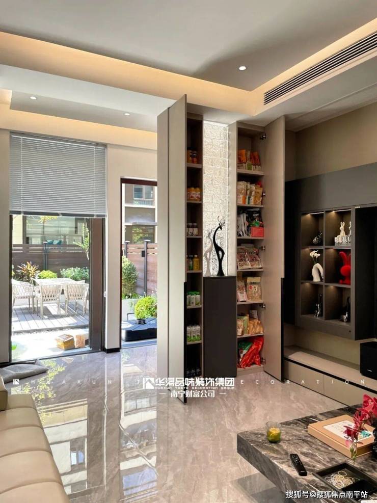 客厅的景致若隐若现。家的开阔气度,从这一刻便开始铺垫。后面打开则是零食柜,玄关和零食柜同时拥有。