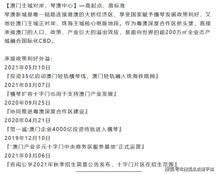 地段优越:位于十字门 CBD,与澳门、横琴隔海对望,是粤港澳大湾区重要节点,发展潜力大。