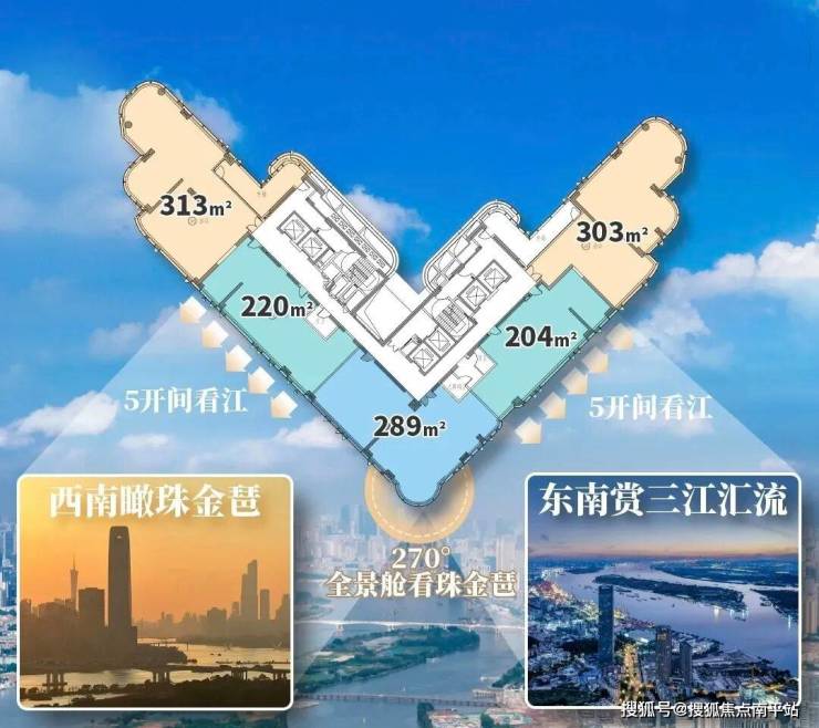 建面约298㎡户型,就更牛了,既有270°全景舱的“珠金琶”景观,同时东南又能看三江汇流浩瀚江景,简直太绝了。