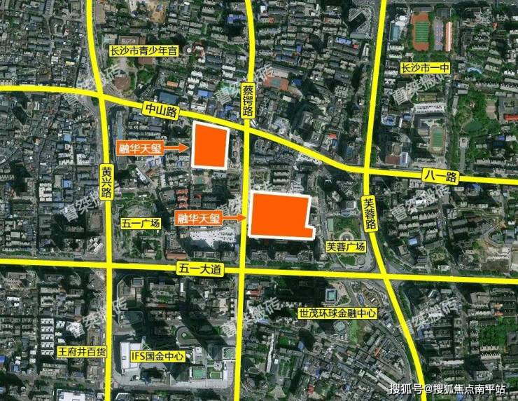 融华天玺项目位于长沙市芙蓉区五一大道与蔡锷路交汇处北侧,五一广场与芙蓉广场之间。项目分为南北两个区,分列蔡锷路东西两侧。
