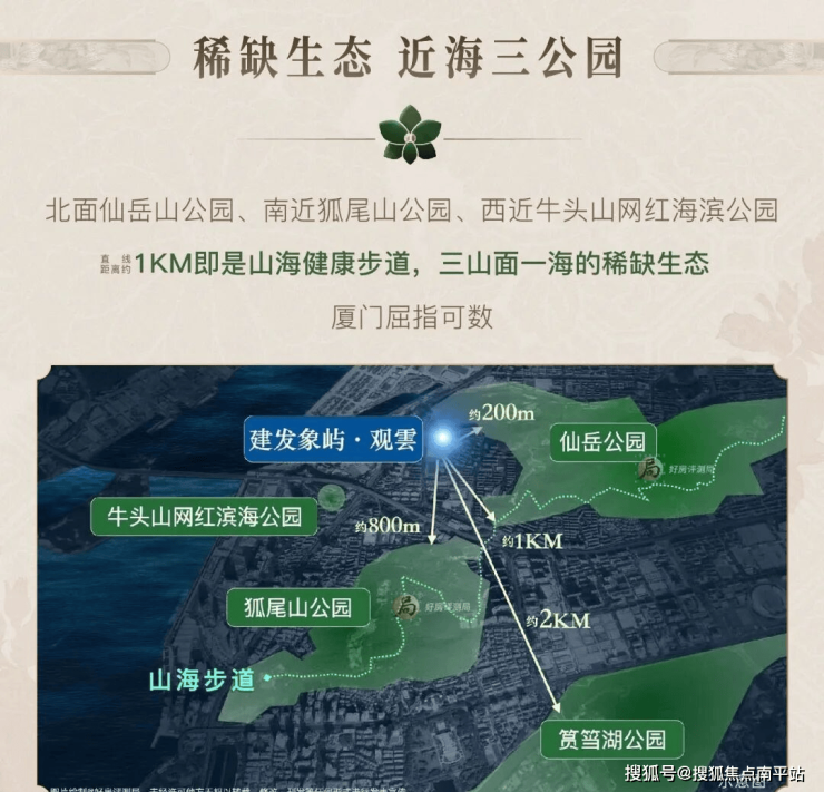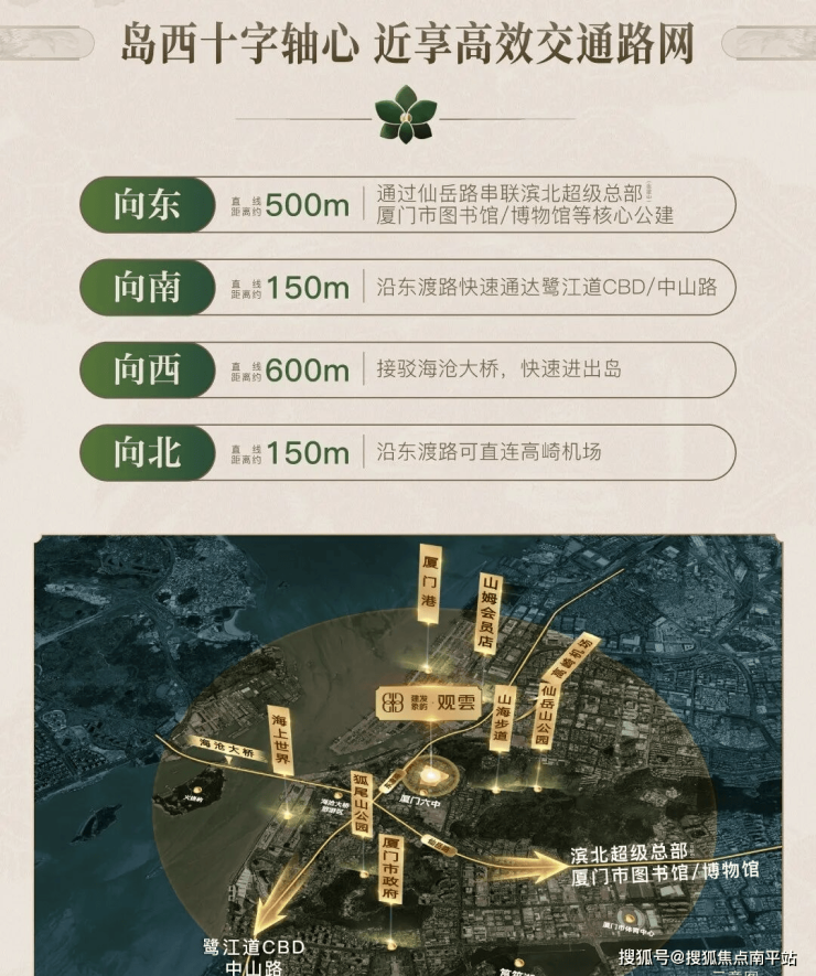 项目占据东渡片区“山、海、城、港”四重资源交汇地,北靠仙岳山、南瞰狐尾山滨海公园,步行可达山海健康步道,生态浓度为岛内天花板。同时位于市府滨北生活圈2公里内,商业、教育配套成熟,自建幼儿园及东渡二小、厦门六中等教育资源,形成全龄教育矩阵。
