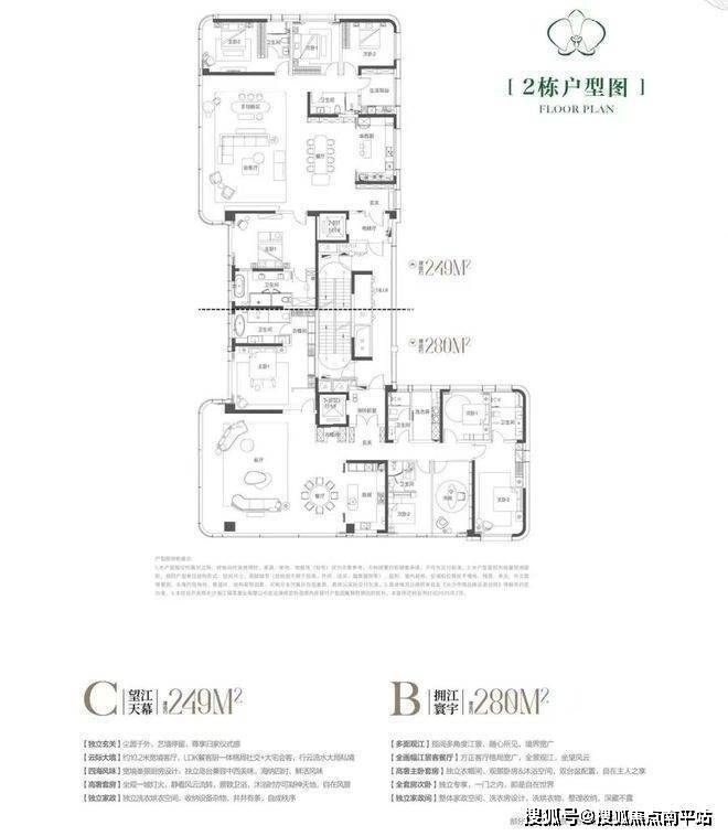 产品分析:户型面积段在212 - 280㎡之间,全部为两梯两户纯板楼,户户可以看江景。