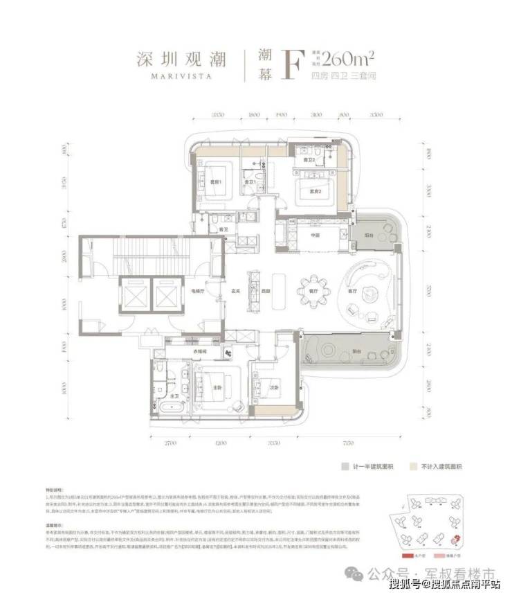 建面约260㎡四房三卫三套间,作为顶格改善大平层,三套间设计是其核心亮点——主卧与两间次卧均带独立卫浴,近乎半数房间为套房配置,无论是三代同堂还是亲友长住,皆能保障全员私密感,在深圳大平层中属于真正的高配水准。搭配270°环景阳台,超大面宽带来极致采光与全景视野,景观资源尽收眼底。