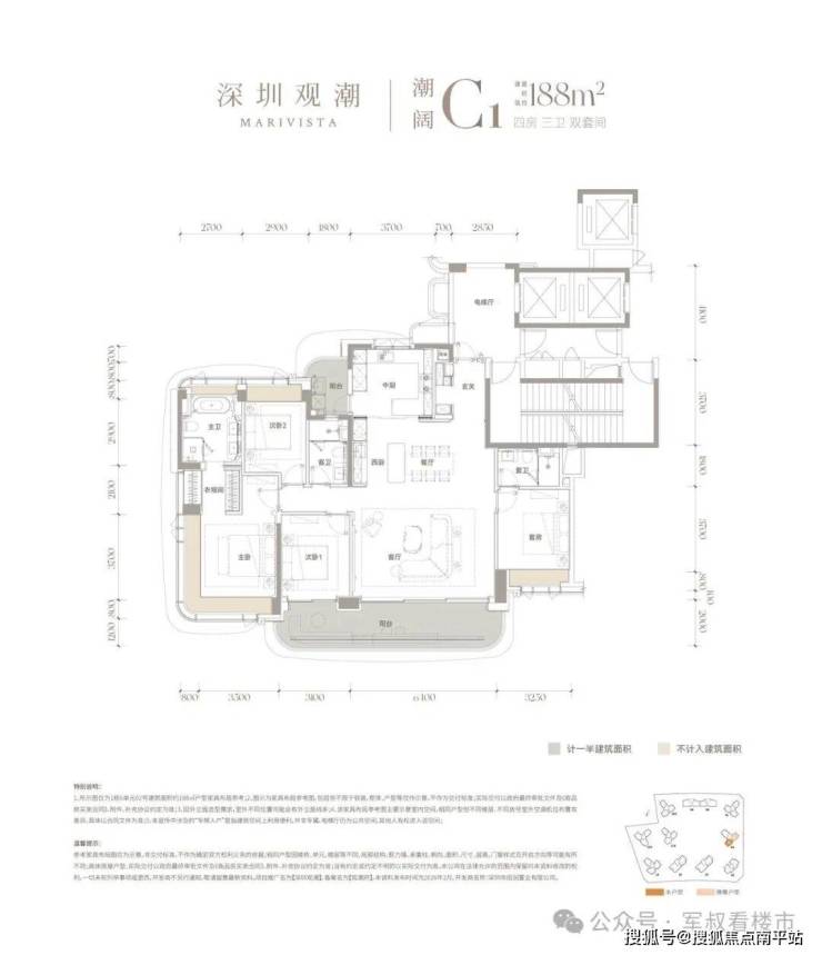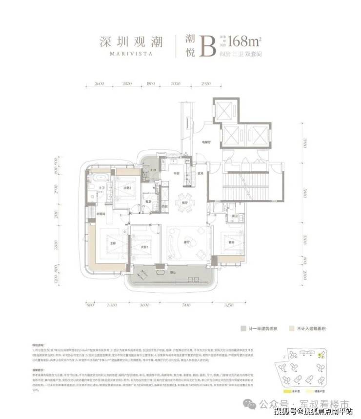 建面约168㎡四房三卫双套间,在深圳改善市场中堪称“起步即舒适”的标杆户型,动静分区清晰合理。户型核心亮点为双套间设计,主卧与一间次卧均配备独立卫浴,私密性拉满;客餐厅一体化连通巨幕阳台,采光面开阔,无论是摆放大尺度沙发,还是打造亲子互动区,空间都绰绰有余。