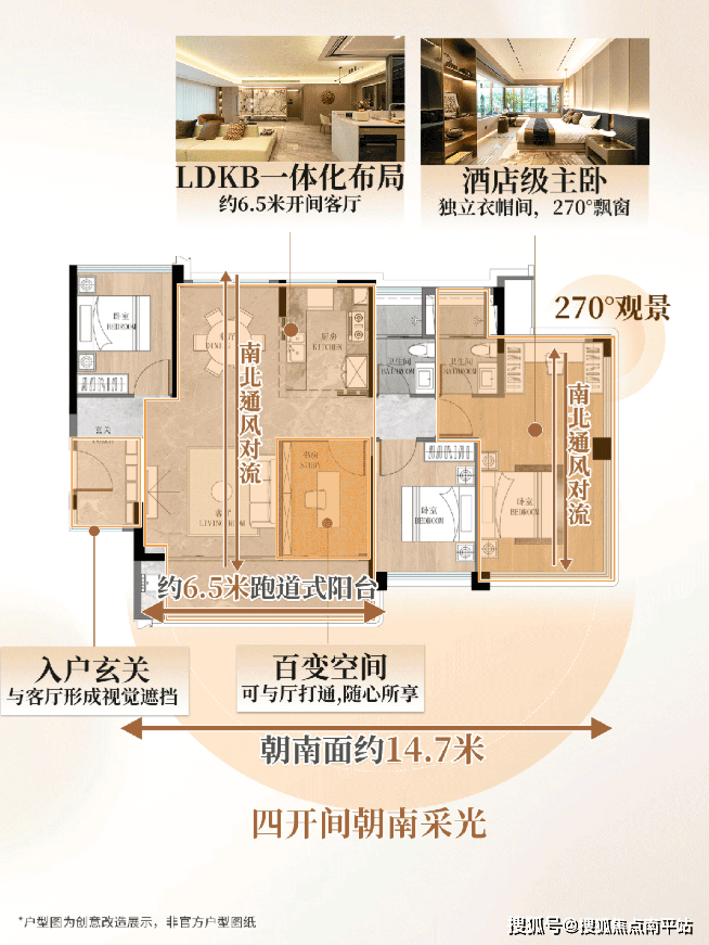 约14.7米南向面宽,餐客厅+主卧均南北通透,清风时时流连